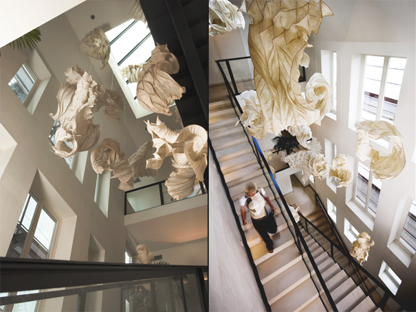 Peter Gentenaar is a demanding print maker. The paper mills weren’t able to provide him with the paper he wanted, so he created it himself, with a customized machine with which he designs ethereal paper sculptures. Behind this venture there’s the help of the Royal Dutch Paper Factory, but the intuition and artistry is all Peter’s. After having built his paper factory, the Dutch print maker designed beaters that are able to process and mill the pulp of the paper fibers that sustain his sculptures, which were on view until March 12th at the exhibition "Papierobjects" in Doesburg. Last Summer, to commemorate the 25th edition of the festival of classical music in St. Riquier, you could admire more than 100 of his sculptures hovering between the Gothic arches of the homonymous French abbey, built in 638. The process of pulling water from the pulp manages to shrink it by as much as 40%. Reinforced with a rigid bamboo framework the sculptures thus takes the form of vaporous Autumn leaves twirling in the wind.